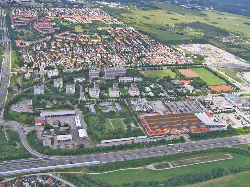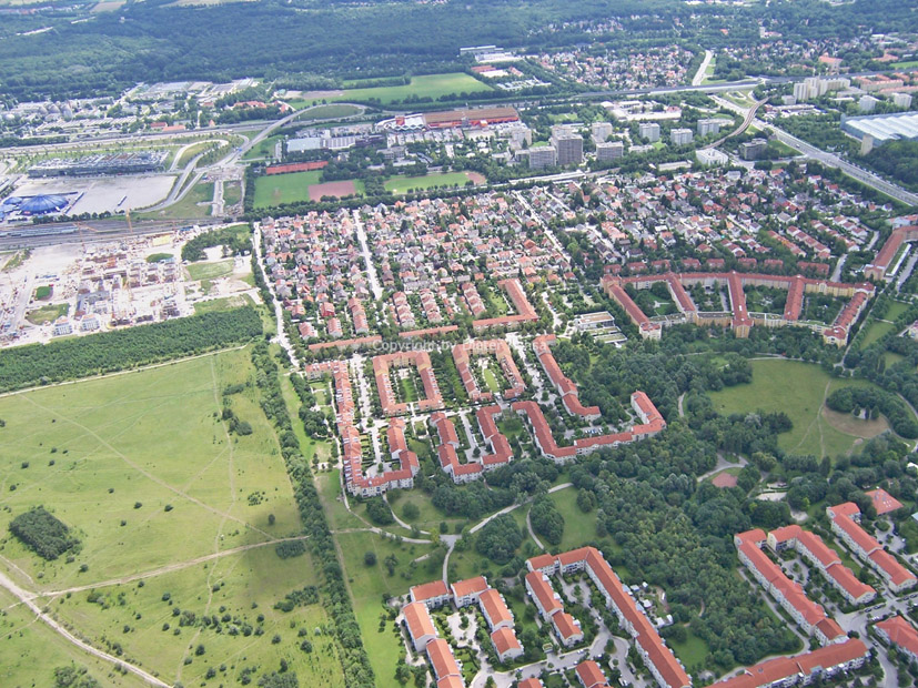 Zwischen der Autobahntrasse der A9 am unteren Bildrand und der Schleißheimer Straße am oberen Rand sind vor allem zu erkennen die
