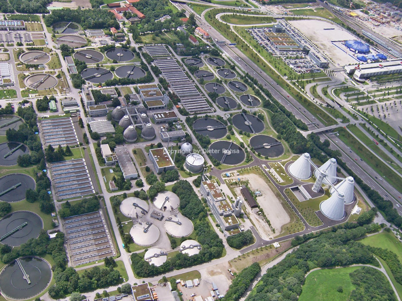 Das Klärwerk München I [Interner Link] mit den neuen Faultürmen [Interner Link] bilden die Schwerpunkte dieser Aufnahme. In der linken Bildmitte oben ist das ehemalige Gut Großlappen [Interner Link] deutlich zu erkennen.