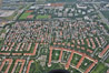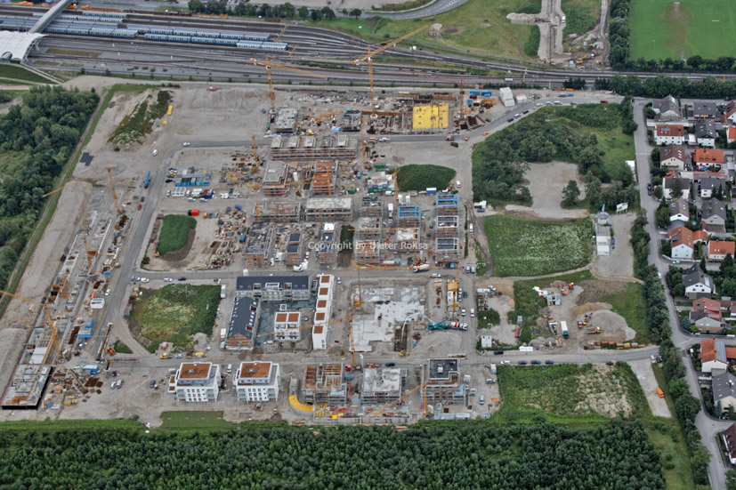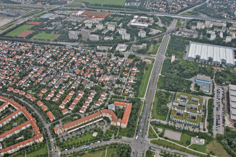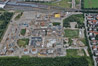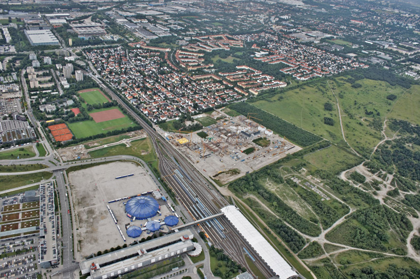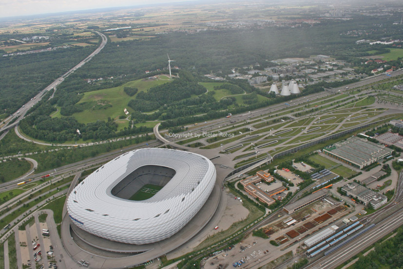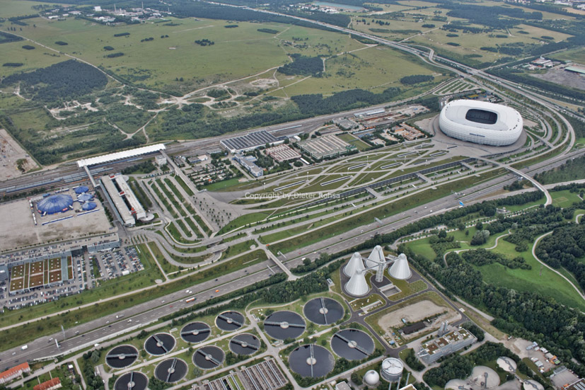 Die sogenannte Esplanade vor der Allianz Arena in der Bildmitte, darunter das Klärwerk München I [Interner Link] mit den neuen Faultürmen [Interner Link], in der oberen Bildhälfte die Fröttmaninger Heide [Interner Link].