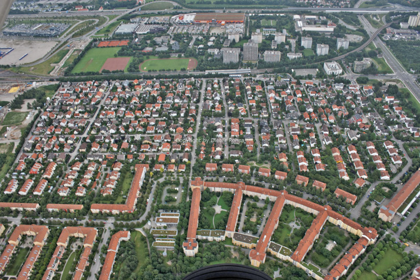 Die Allianz Arena und die sogenannte Esplanade in der Bildmitte, darüber der Fröttmaninger Berg [Interner Link] und das Klärwerk München I [Interner Link] mit den neuen Faultürmen [Interner Link].