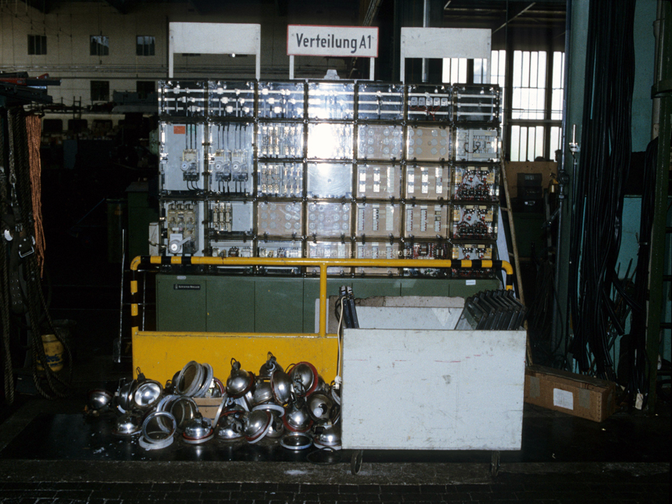 (Elektrische Teilwerkstätte) sechsschiffig mit sechs Kranbahnen, die südlichen Schiffe von Lichthöfen unterbrochen; nach Osten vorgelagert Dienstgebäude, zweigeschossig mit eingezogenem Obergeschoß und